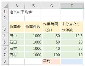 例題2では、D列の項目が速さを示しており、1分当たりに処理する件数が速さに