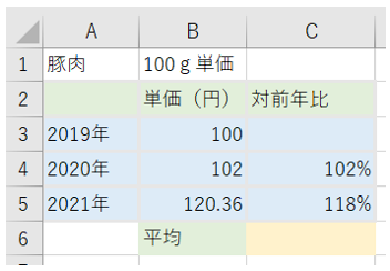 2021年時点の豚肉の値段は、100×1.02×1.18=120.36になりますよね。