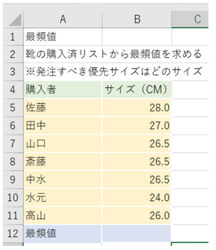 セルB12に数式「=MODE.SNGL(B5:B11)」を入力します。