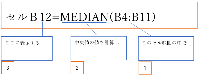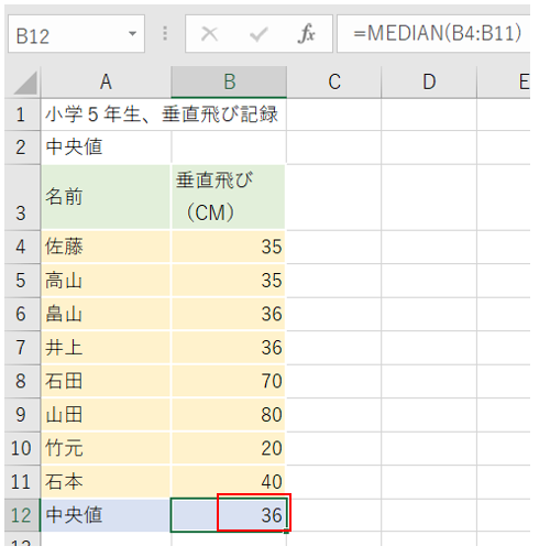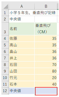 セルB12に数式「=MEDIAN(B4:B11)」を入力します。