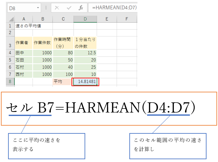 ‘1分当たりの平均の速さを計算(件数/分)セルB7に数式「=HARMEAN(D4:D7)」を入力します。すると平均値14.81が表示されます。
