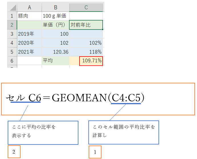セルC6に数式「=GEOMEAN(C4:C5)」を入力します。