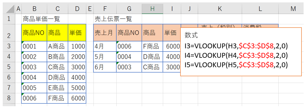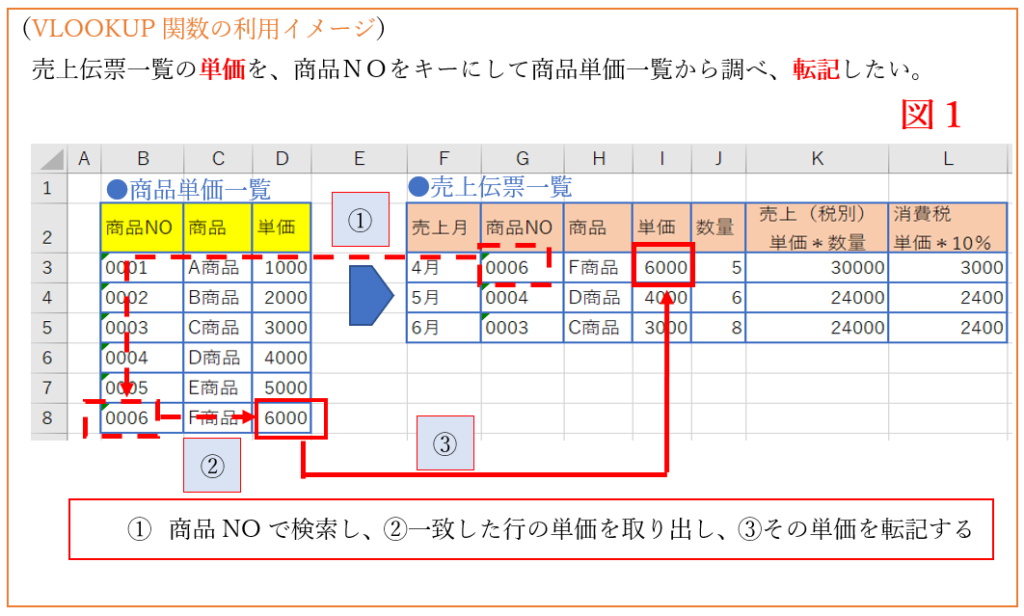 具体的には、図1のように、VLOOKUPは、商品単価一覧の商品NOを縦に調べ、一致した商品NOの横(行)方向にある単価を、売上伝票一覧に転記する仕組みです。