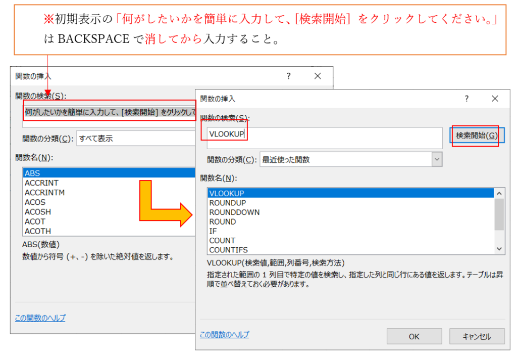 ②関数の検索のテキストボックスに半角入力で「VLOOKUP」と入力し「検索開始」をクリック