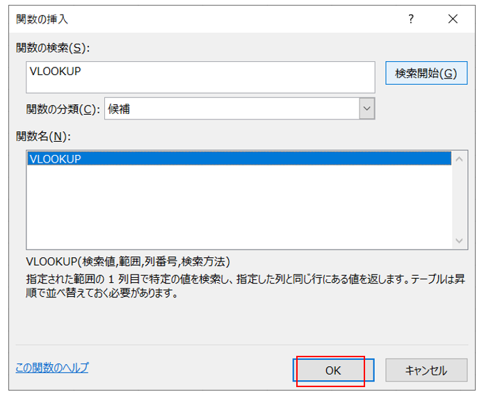 ③関数名にVLOOKUPが表示されることを確認しOKクリック