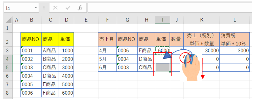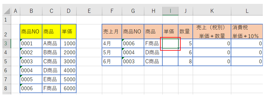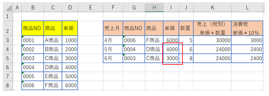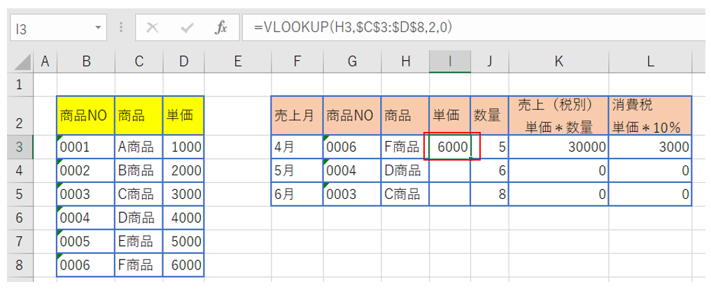 ⑧セルI3にF商品の単価6000が表示されたことを確認