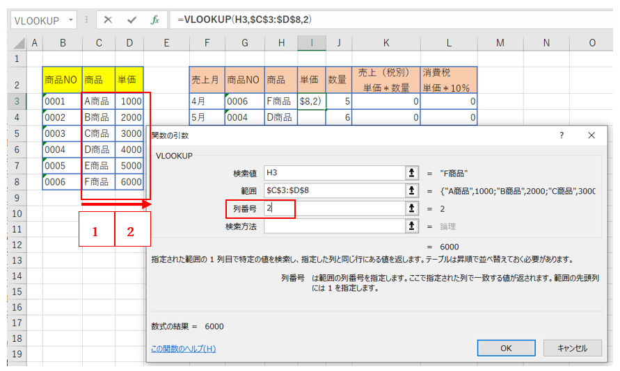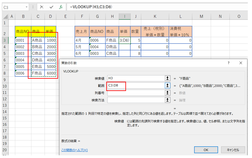 ※範囲選択する際は、左表で商品(C列)を探して、隣の単価(D列)を転記するので、商品と単価を含む範囲(C列からD列まで)を選択すること。
