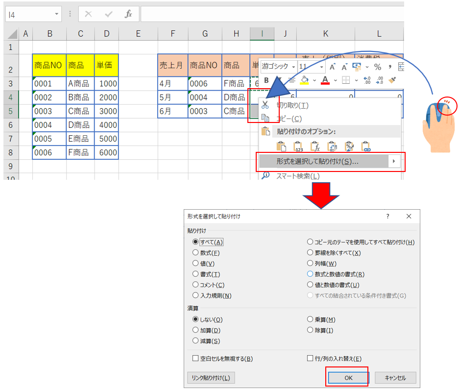 セルI4からI5のセルの上で、マウス右クリックし、形式を指定して貼り付けを選択、その後、OKクリック